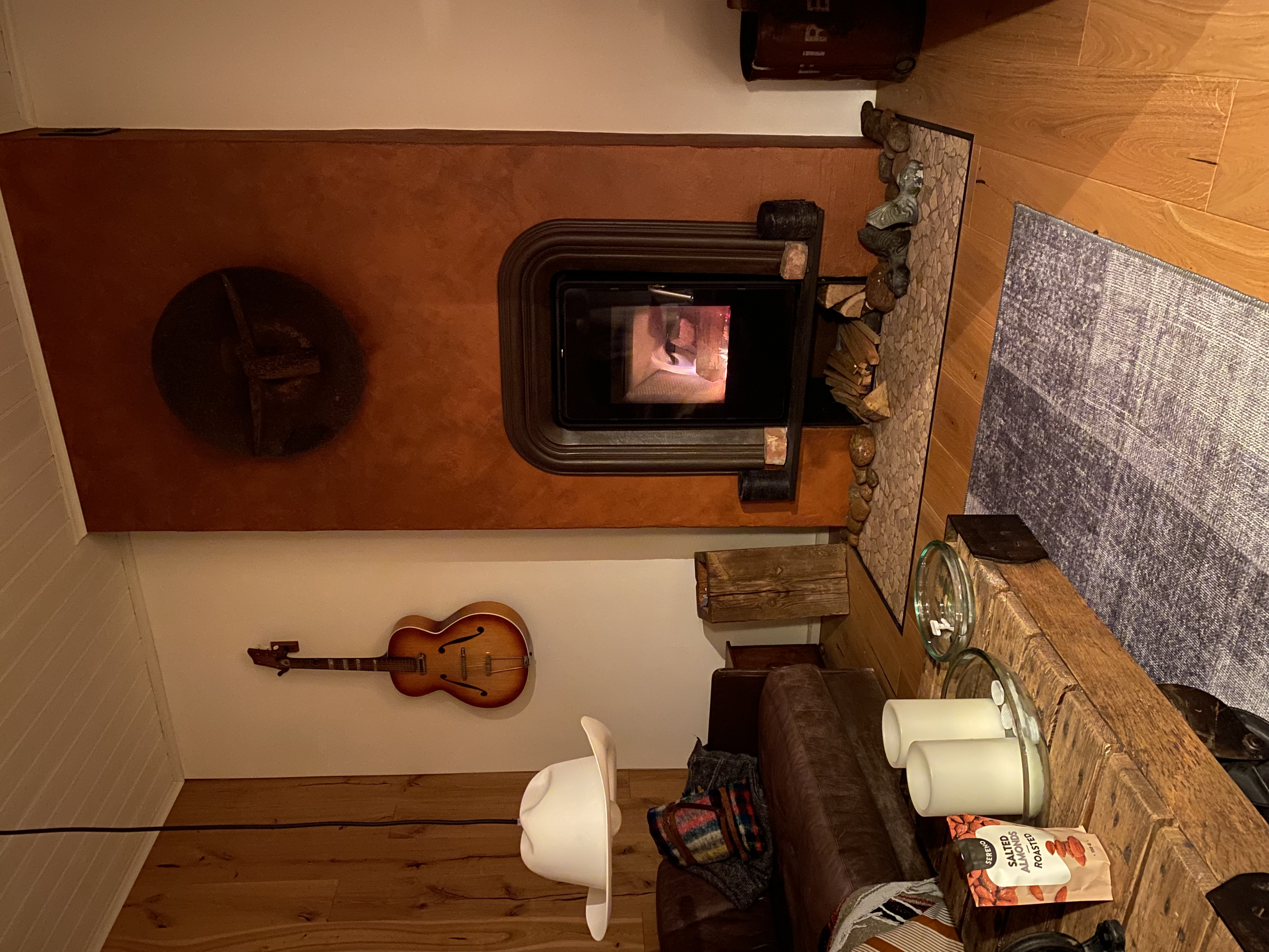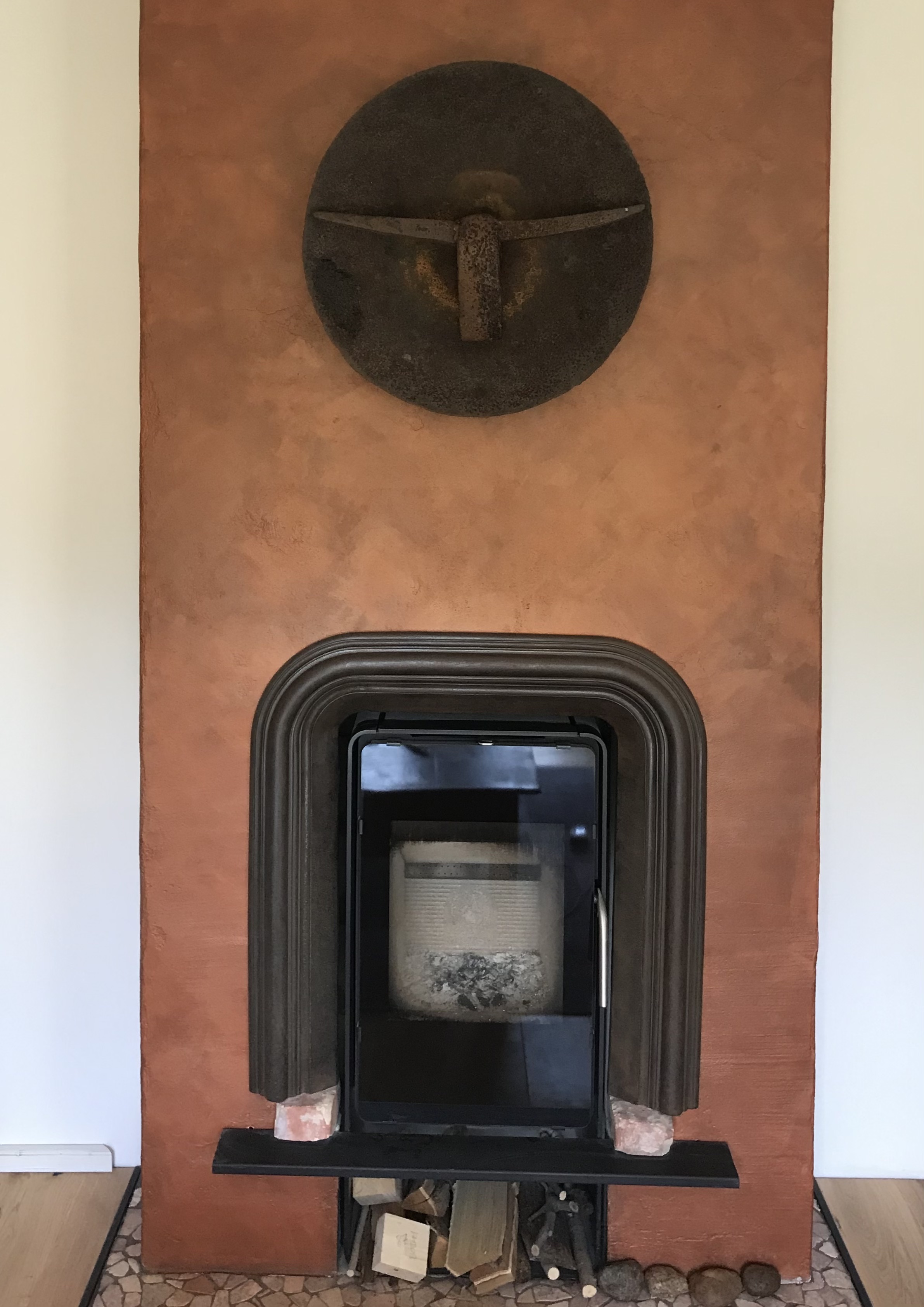 A modern stove and masoned chimney was fitted right into and around this cast iron Victorian mantlepiece from 1871. Another find that found its way into a new life.