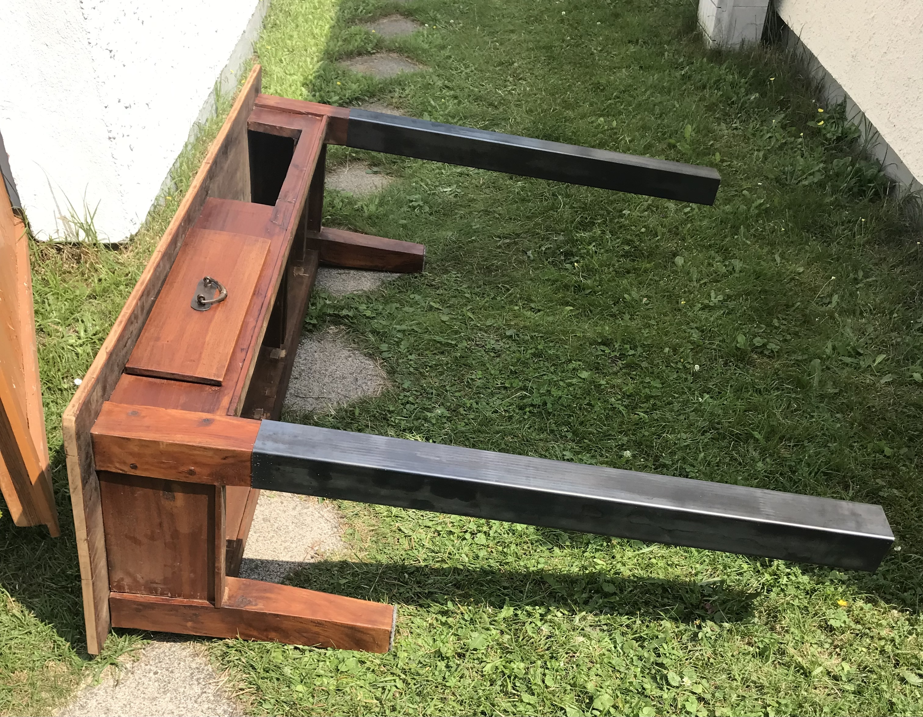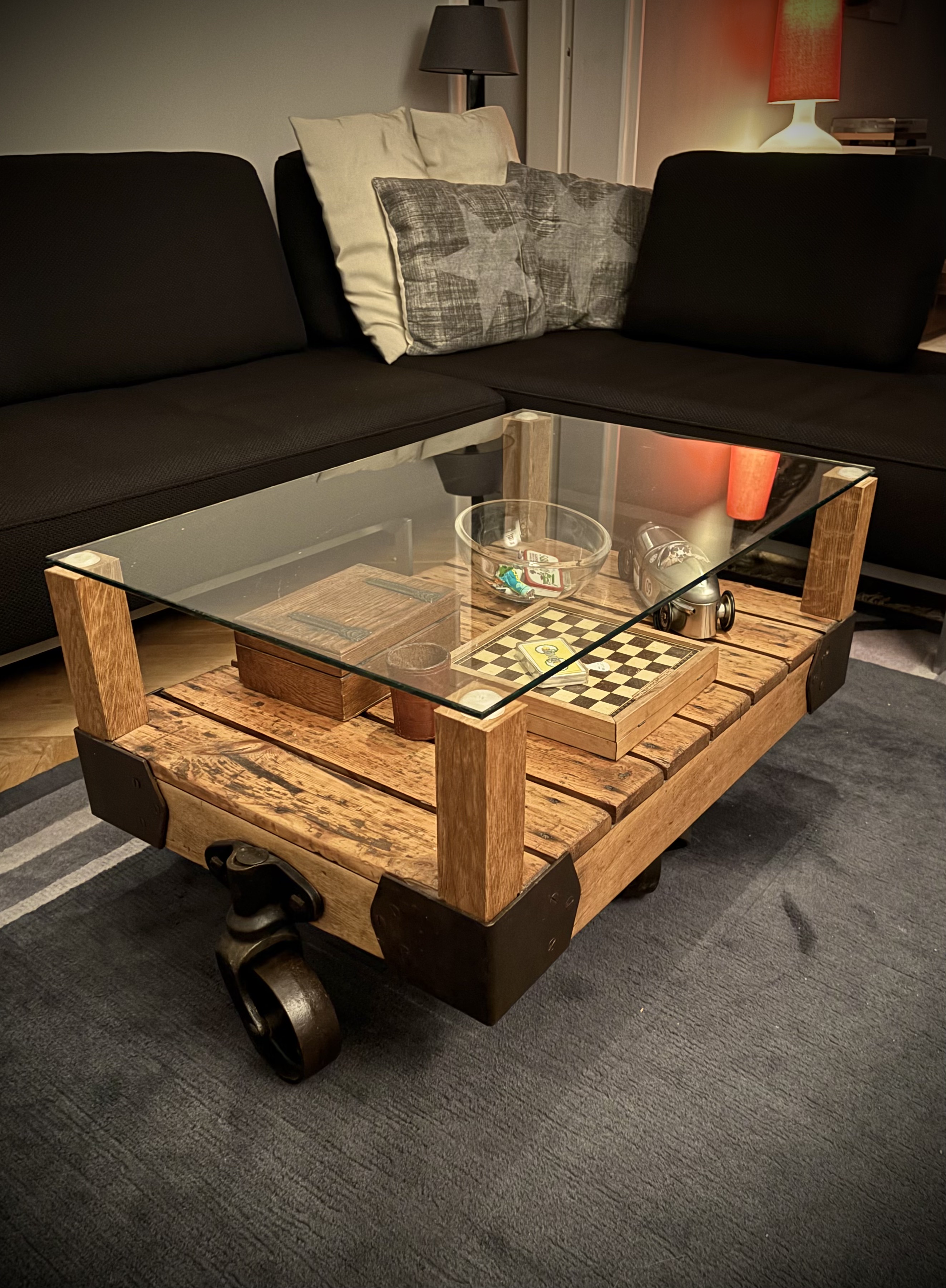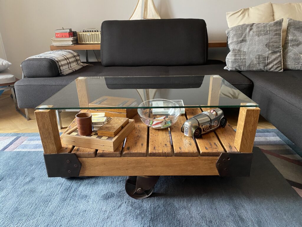 Die Basis dieser Arbeit war eine 100 Jahre alte Holzkarre aus einer verlassenen Erdmöbel Manufaktur. Nach der Überarbeitung, entstand ein schönes Möbelstück für das Wohnzimmer.