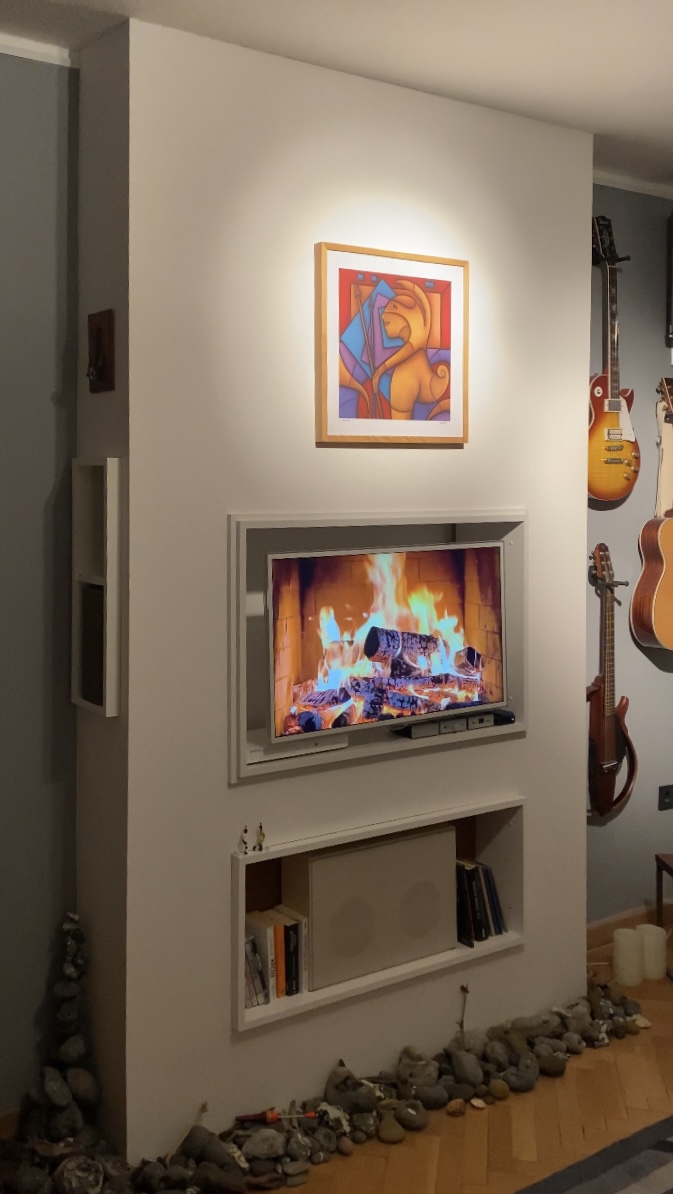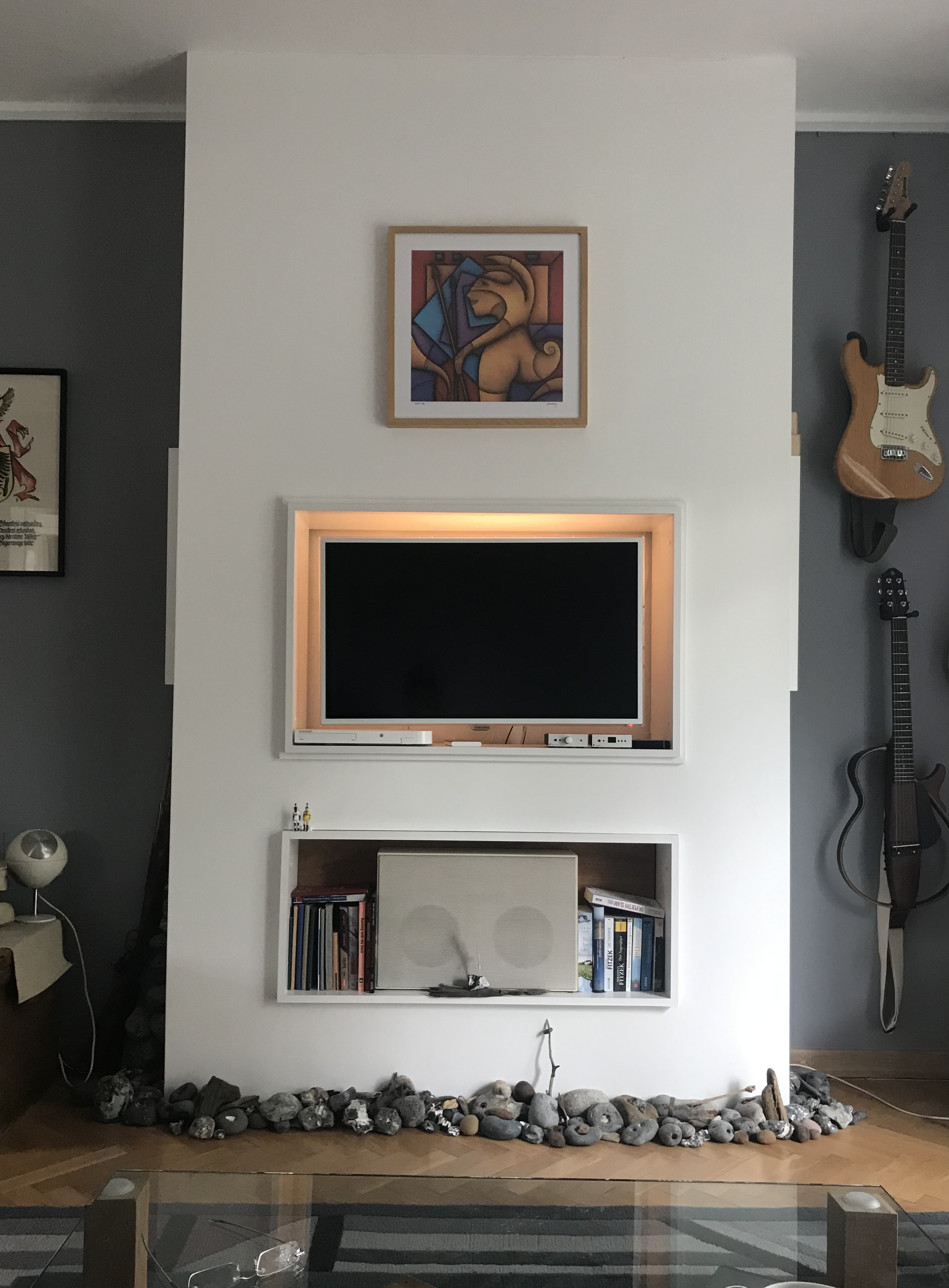 Not everyone wants a huge wall unit stretch across the room. This type of construction is only e.g. 30cm deep, allows for a variable width and individual divisions. Hide all annoying cables and/or electronics but yet with easy access.