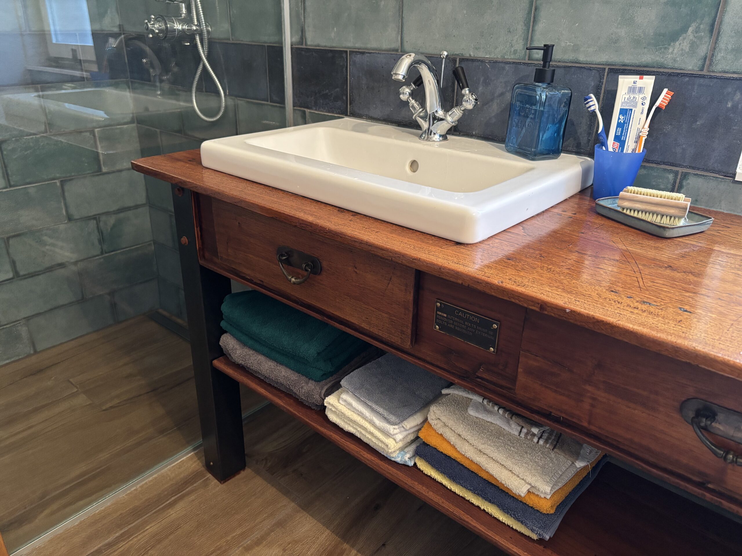 Der komplette Raum wurde anschließend neu gestaltet mit Fliesen, Wand- und Bodendielen.